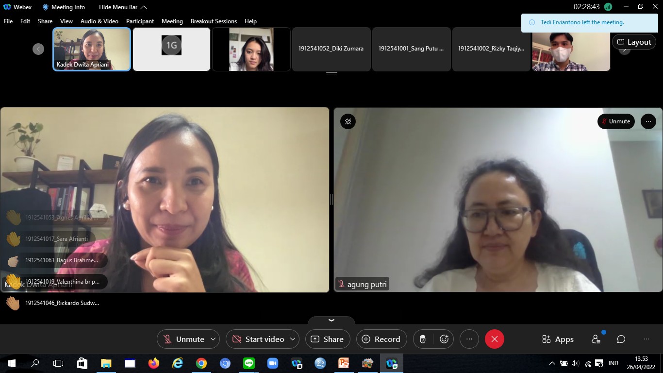 DENPASAR, kanalbali.id- Dalam rangka menyemarakkan peringatan Hari Kartini, Program Studi Ilmu Politik Universitas Udayana laksanakan Kuliah Tamu “Perempuan Dalam Dunia Politik”, secara daring dengan mengundang Dra. I Gusti Agung Putri Astrid Kartika, M.A., selaku narasumber. (26/04/2022)