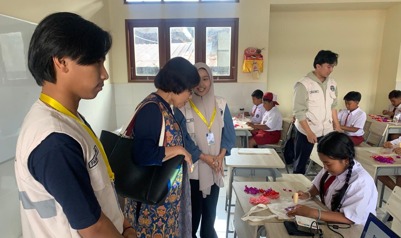 Saat itu, mahasiswa sedang memperkenalkan tehnik Ecoprint, yakni pewarnaan kain ramah lingkungan dengan memanfaatkan daun dan bunga yang ada di sekitar rumah dan sekolah.