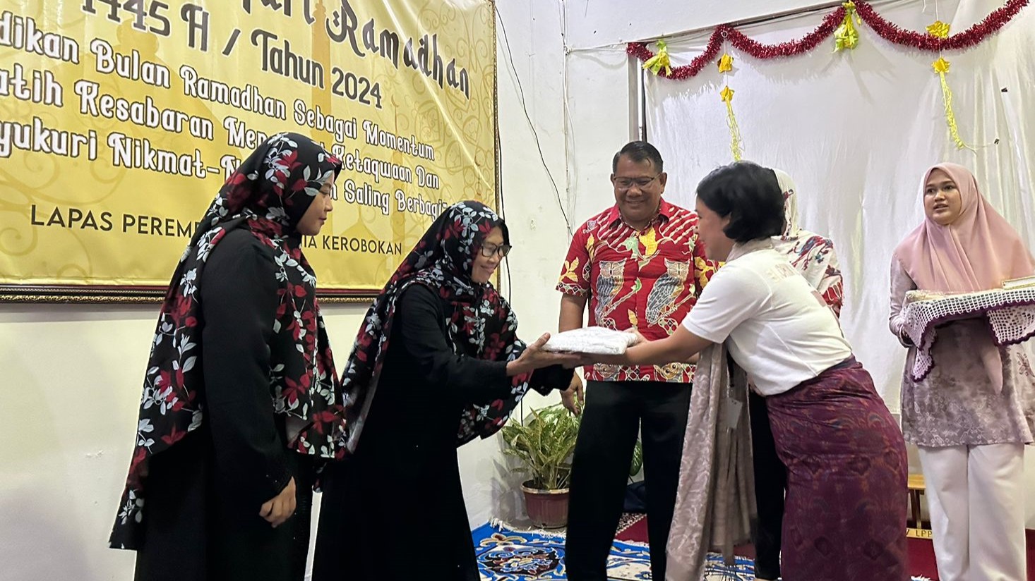 Kegiatan dilanjutkan dengan menyerahkan bantuan berupa Mukenah kepada WBP Lapas Perempuan oleh Ketua Yayasan Elohim Ministry Bali.