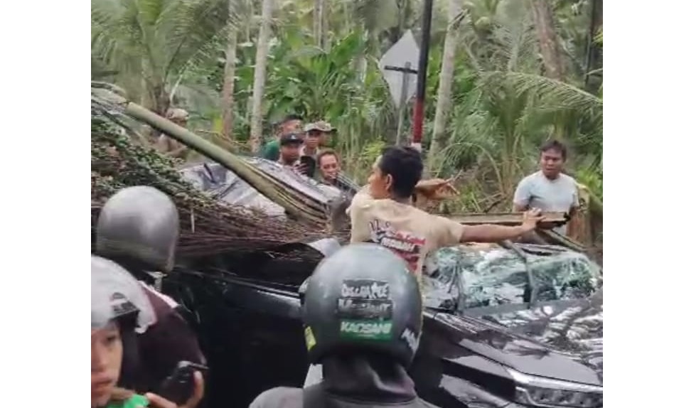 “Peristiwa pohon tumbang jenis pohon aren yang berdiameter kurang lebih 35 cm dengan panjang kurang lebih 15 meter menimpa pengendara mobil yang melintas,” kata Iptu Sukadana, Sabtu (223) malam.