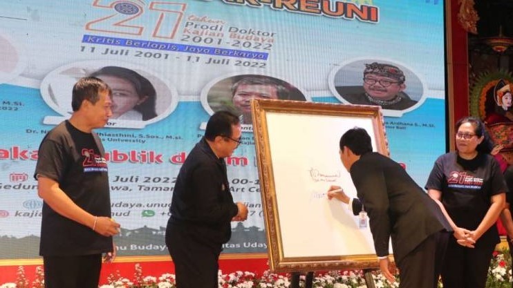 DENPASAR, kanalbali.id – Program Studi Doktor (S3) Kajian Budaya FIB Unud menyelenggarakan Seminar “Kebijakan Publik dalam Kajian Budaya” yang dirangkaikan dengan Reuni dalam rangka perayaan HUT ke-21 bertempat di Gedung Ksirarnawa Taman Budaya Art Centre Provinsi Bali, Senin (18/07/2022).