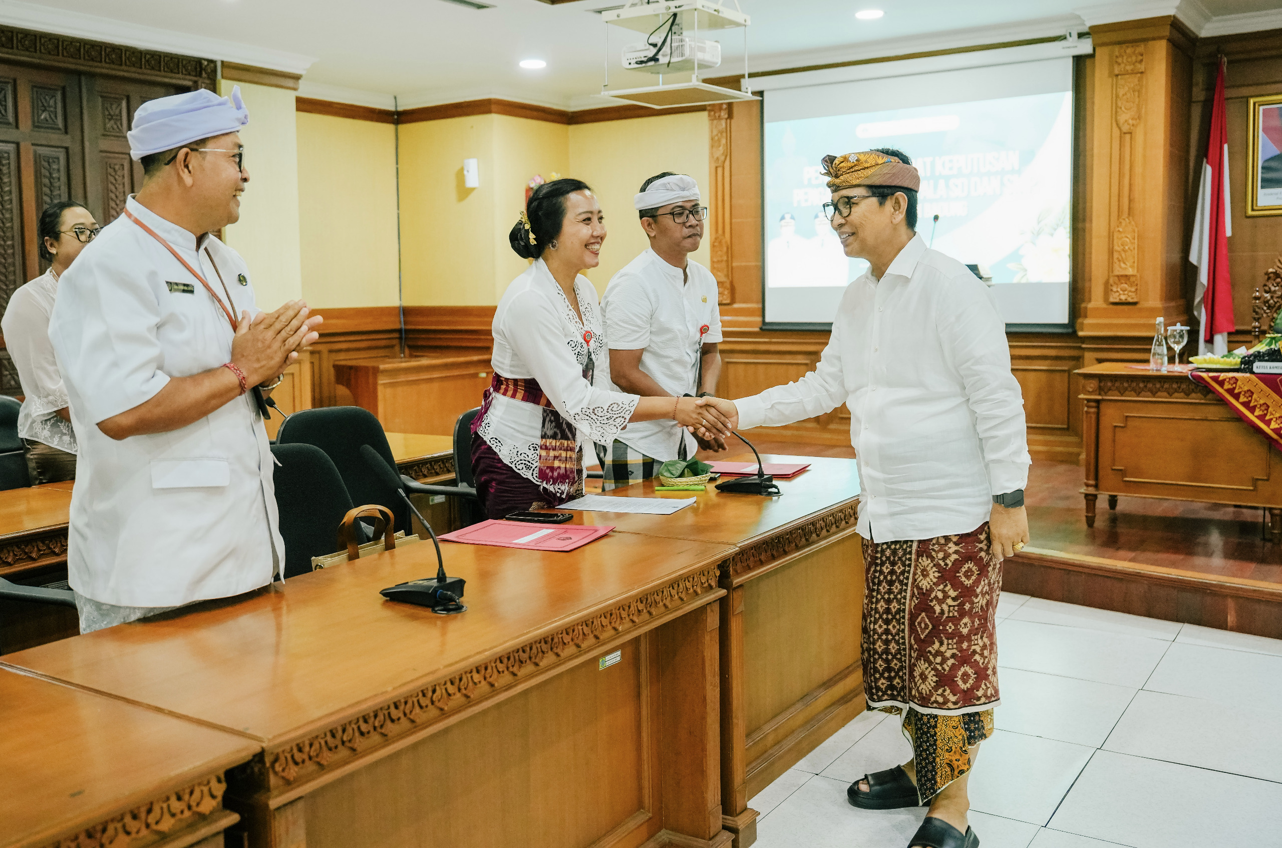 SK tersebut dibacakan oleh Kepala Dinas Pendidikan, Kepemudaan, dan Olahraga Kabupaten Badung, I Gusti Made Dwipayana. Sebanyak 25 Guru resmi diangkat menjadi Kepala Sekolah Negeri, yang terdiri atas 24 Kepala Sekolah Dasar (SD) dan 1 Kepala Sekolah Menengah Pertama (SMP).