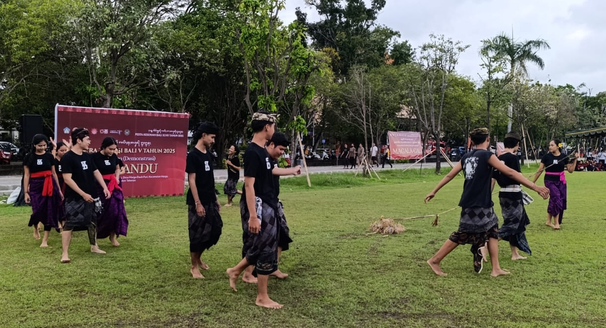 Bola-bola jerami yang disebut gandu, tali guntung, dan pelepah pisang kering jadi pusat perhatian. Gerak lincah peserta yang penuh semangat berhasil membetot minat warga dan wisatawan yang tengah beraktivitas pagi di kawasan pusat pemerintahan dan rekreasi Bali itu.