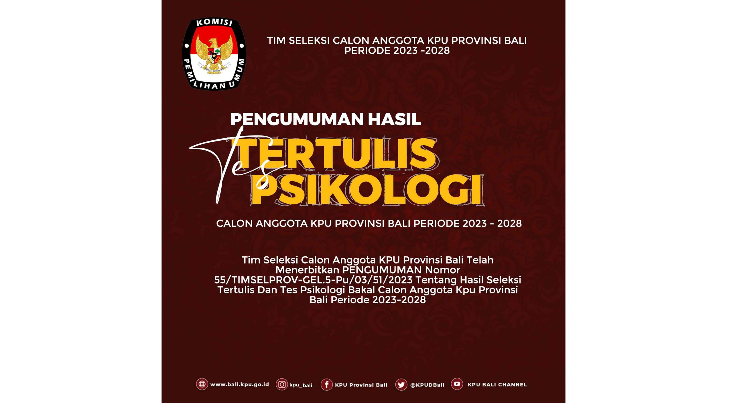 DENPASAR, kanalbali.id – Tim Seleksi Calon Anggota KPU Bali Telah Menerbitkan PENGUMUMAN Nomor 55/TIMSELPROV-GEL.5-Pu/03/51/2023 Tentang Hasil Seleksi Tertulis Dan Tes Psikologi Bakal Calon Anggota Kpu Provinsi Bali Periode 2023-2028.
