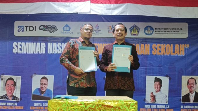 DENPASAR, kanalbali.id – SMK TI Bali Global Badung melakukan penandatanganan kerjasama program vokasi bersama PT Tera Data Indonusa Tbk (AXIO). Kerjasama industri itu berkaitan dengan Axioo Class Program (ACP) untuk siswa-siswi di SMK TI Bali Global Badung.