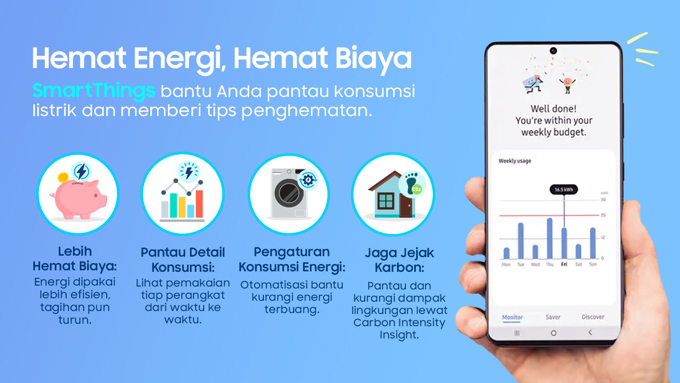 Selain membantu menghemat biaya, SmartThings turut mendukung gaya hidup hemat energi. Otomatisasi perangkat mengurangi energi terbuang dan membantu menekan jejak karbon. Pemantauan yang akurat memungkinkan kamu membuat keputusan cerdas dalam penggunaan energi, menjadikan hidup lebih efisien, teratur, dan berkelanjutan.