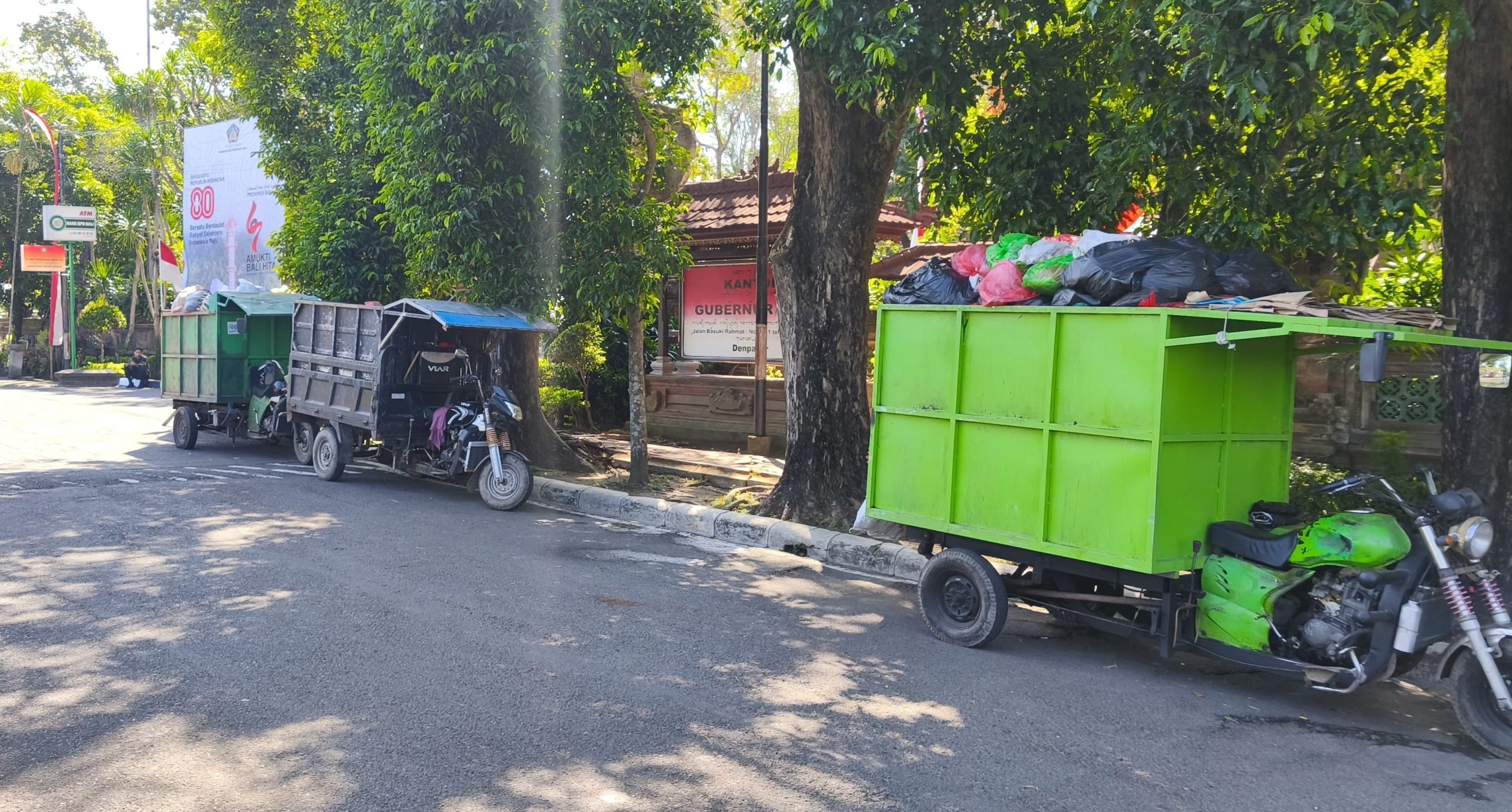 Sejumlah motor pengangkuta sampah memarkir kendaraannnya lengkap dengan sampah yang biasa diangkutnya. Aksi ini sebagai protes atas kebijakan Pemerintah Provinsi (Pemprov) Bali yang tidak memperbolehkan mereka mengirim sampah ke depo atau tempat pembuangan sampah (TPS).