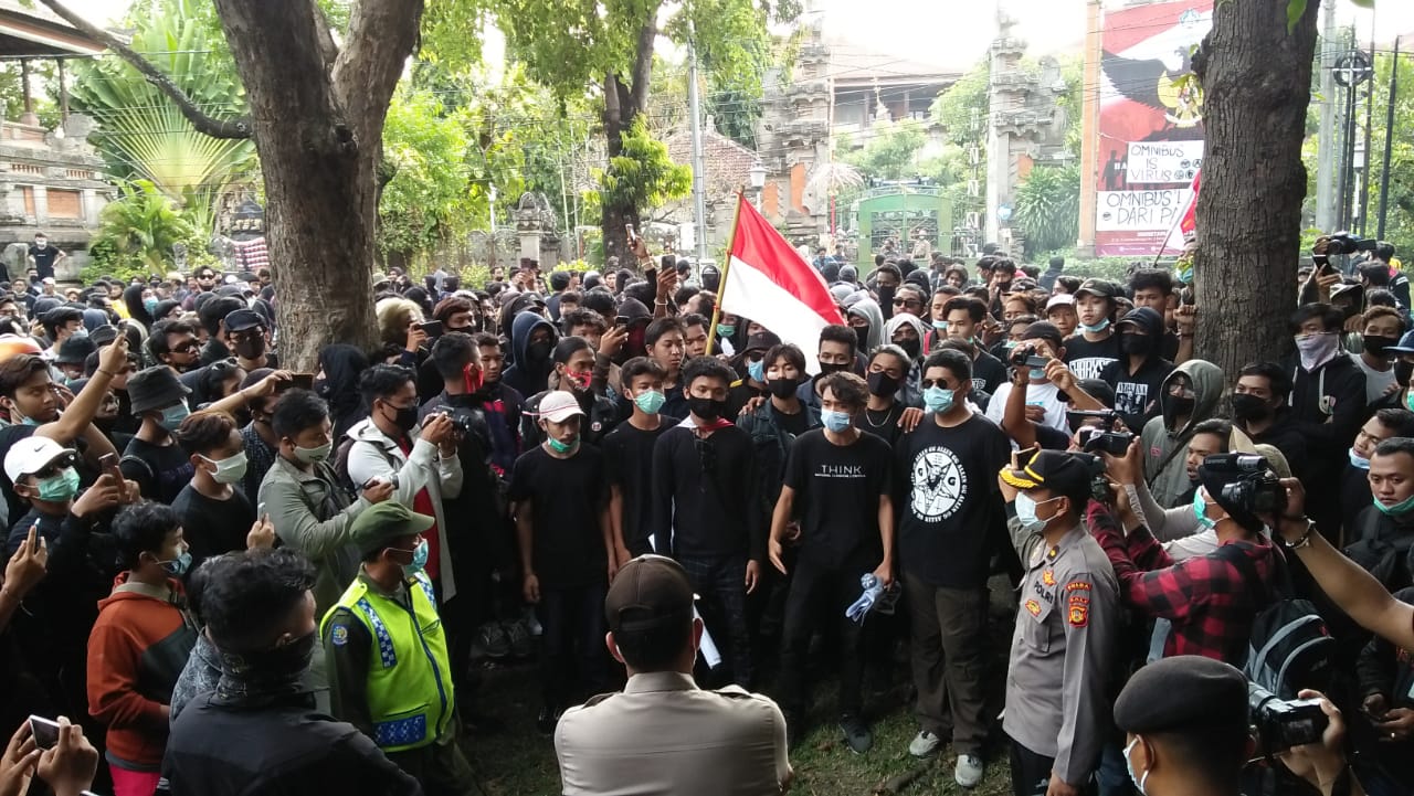 Seperti yang diberitakan, para ratusan massa aksi menutup Jalan Sudirman, Denpasar, Bali, dan akhirnya ricuh kemudian dibubarkan oleh pihak kepolisian, pada pukul 18:18 Wita, Kamis (8/10).