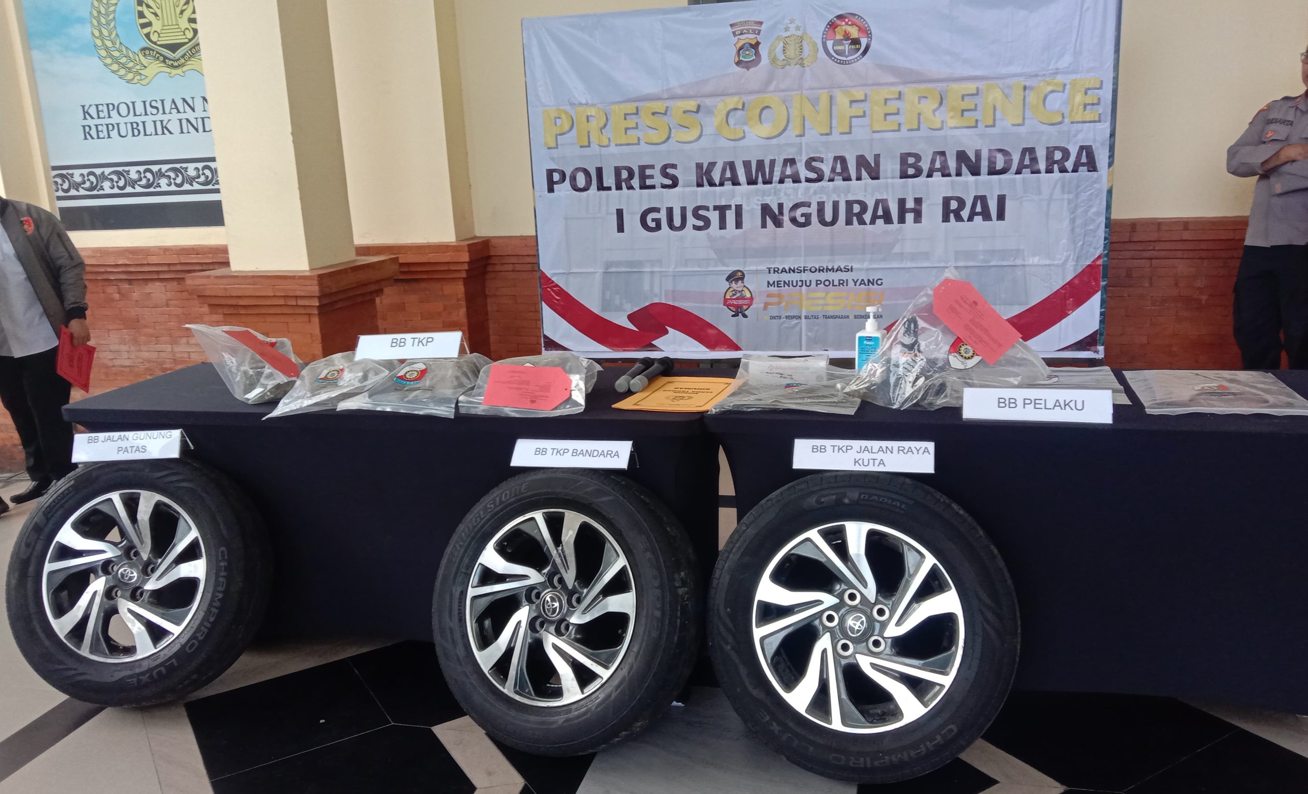 BADUNG, kanalbali.id – Dua pelaku kasus pencurian velg beserta ban mobil yang terjadi di parkir Gedung MLCP Bandara Internasional I Gusti Ngurah Rai Bali akhirnya tertangkap.