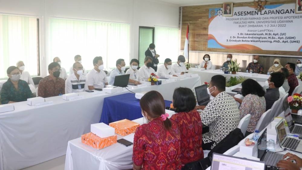 JIMBARAN, kanalbali.id – Program Studi Farmasi dan Profesi Apoteker Fakultas MIPA Universitas Udayana (Unud) dikunjungi oleh Tim Asesor Lembaga Akreditasi Mandiri Pendidikan Tinggi Kesehatan (LAM-PTKes) dalam rangka asesmen lapangan akreditasi program studi bertempat di Gedung Dekanat Fakultas MIPA Kampus Jimbaran, Jumat (01/07/2022).