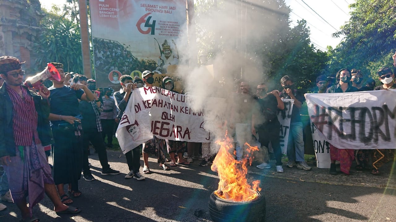 Gelaran aksi unjuk rasa itu dimulai pukul 15:30 WITA. Massa aksi mengenakan pakaian adat Bali berkumpul dari areal parkir Timur lapangan Bajra Sandi, Renon berjalan menuju depan Kantor DPRD Provinsi Bali.