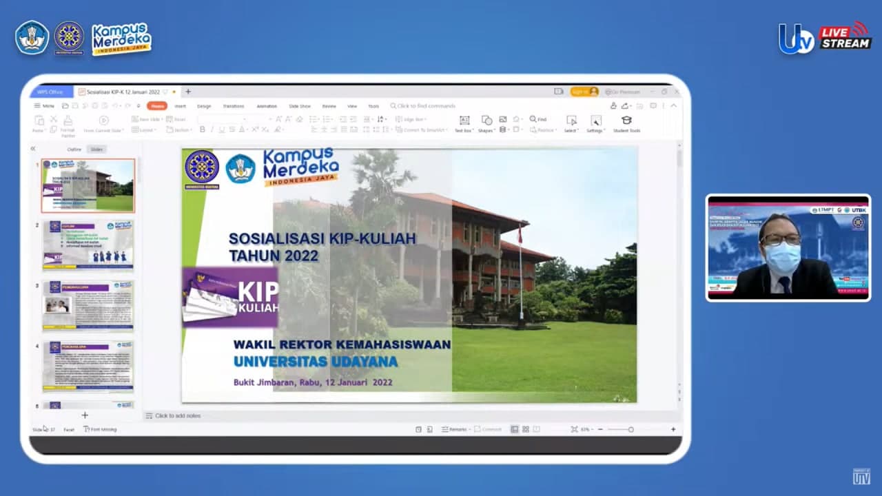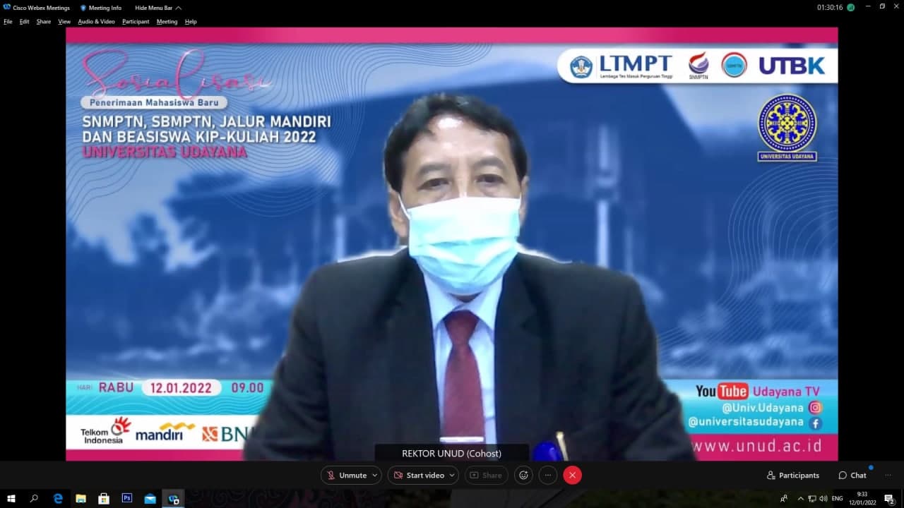 DENPASAR, kanalbali.id – Universitas Udayana selenggarakan “Sosialisasi Penerimaan Mahasiswa Baru Jalur SNMPTN, SBMPTN, Jalur Mandiri dan Beasiswa KIP-Kuliah Tahun 2022” yang berlangsung secara daring melalui aplikasi Cisco Webex, Rabu (12/01/2022). Sosialisasi menghadirkan dua narasumber yakni Wakil Rektor Bidang Akademik Prof. Dr. Ir. I Gede Rai Maya Temaja, MP dan Wakil Rektor Bidang Kemahasiswaan Prof. Ir. Ngakan Putu Gede Suardana, MT.,Ph.D.,IPU.
