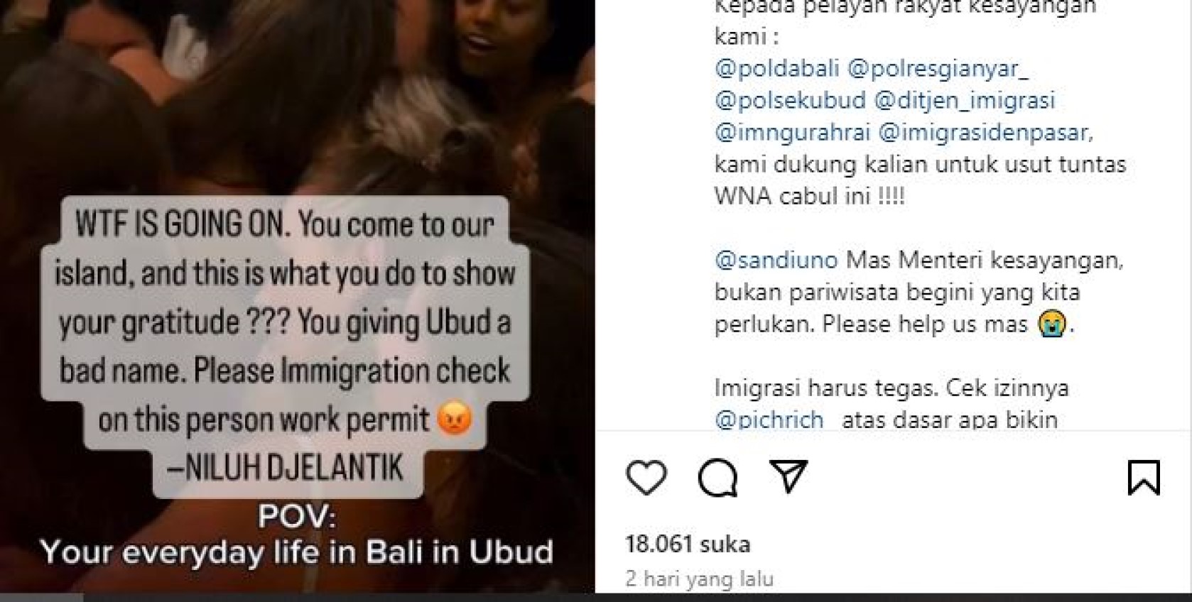 “Tangkap dan usir WNA sampah,” tulis Ni Luh, dikutip Minggu (12/5).