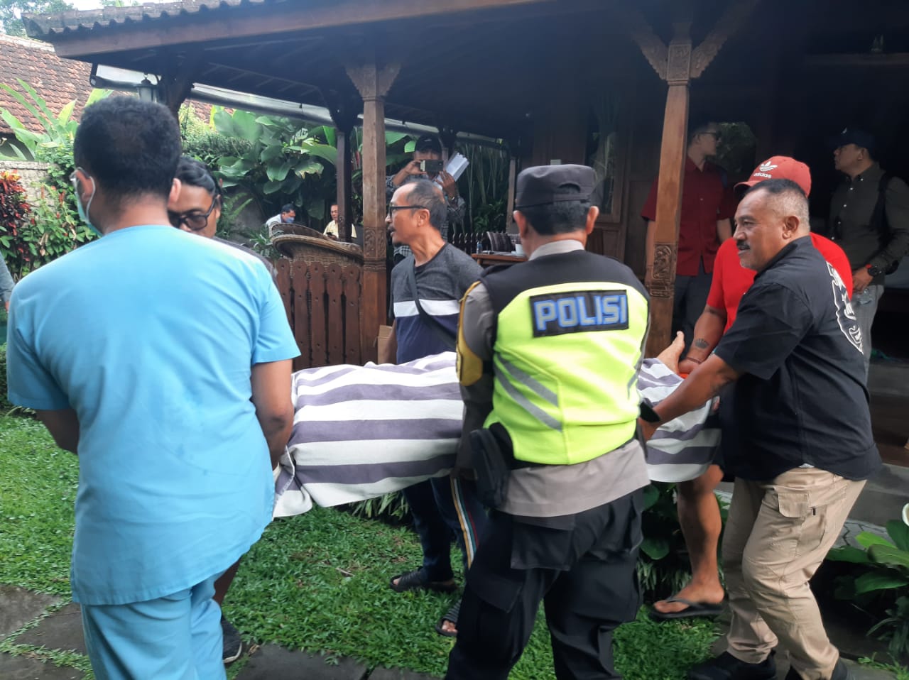Kemudian, saksi melaporkan kejadian tersebut ke Polsek Ubud melalui telpon dan juga menghubungi pihak Klinik BIMC Sanggingan, Ubud. Lalu, pada pukul 08.30 WITA personil Polsek Ubud tiba di TKP melakukan olah TKP dan pemeriksaan luar sekaligus penanganan awal terhadap tubuh korban bersama tim medis Klinik BIMC.