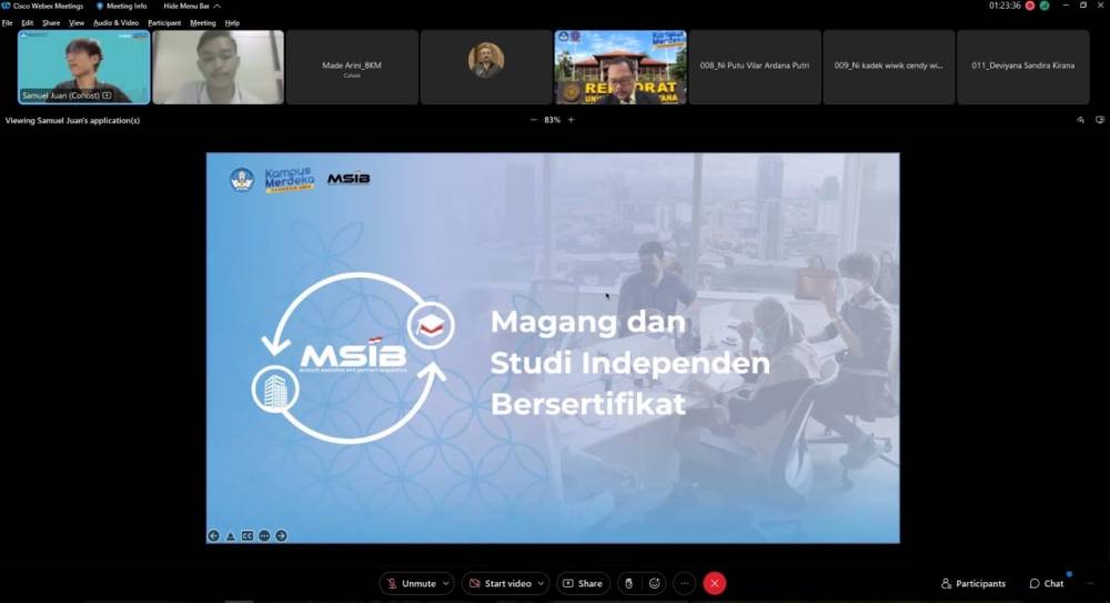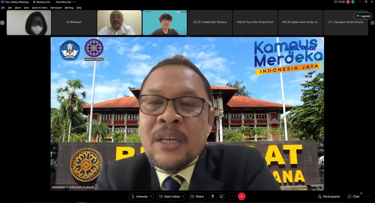 DENPASAR, kanalbali.id – Biro Kemahasiswaan Universitas Udayana menggelar pembekalan bagi calon peserta program Magang Studi Independence Bersertifikat (MSIB) Batch 3 secara daring melalui aplikasi Cisco Webex, Senin (04/07/2022).