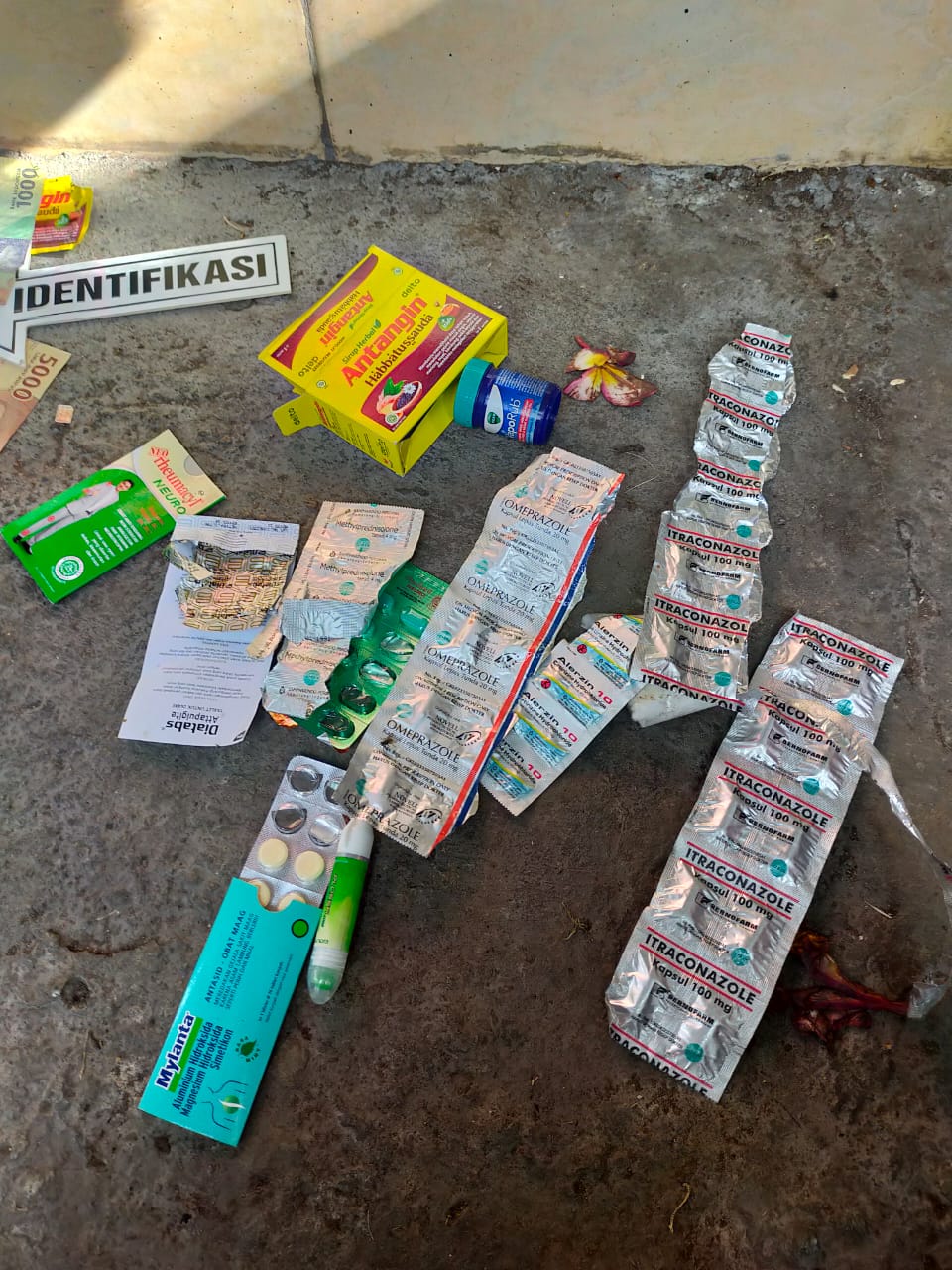 Selain itu, saat ditemukan korban dalam keadaan sudah bau dan membusuk di beberapa bagian tubuhnya, dengan mengenakan pakaian baju kaus lengan panjang warna putih, celana pendek kays warna biru garis putih dan di sekitar mayat pelaku terdapat berbagai jenis obat- obatan.