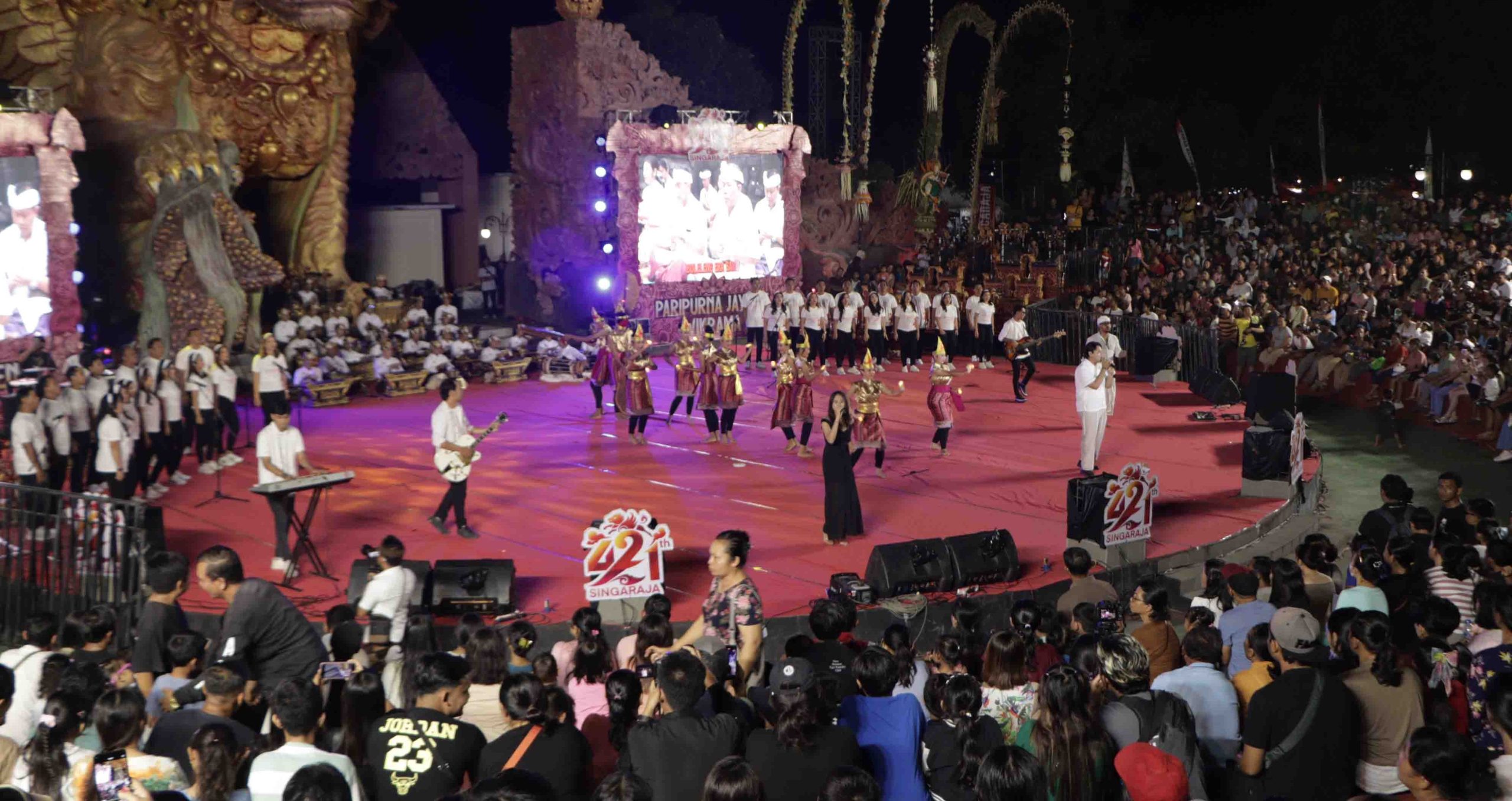 Tampak ribuan masyarakat tumpah ruah memadati RTH Taman Bung Karno. Masyarakat yang mendatangi RTH Taman Bung Karno ini berasal dari seluruh penjuru Kabupaten Buleleng dan datang dari berbagai kalangan. Mereka tampak sangat menikmati hiburan tradisional yang disajikan di panggung utama.